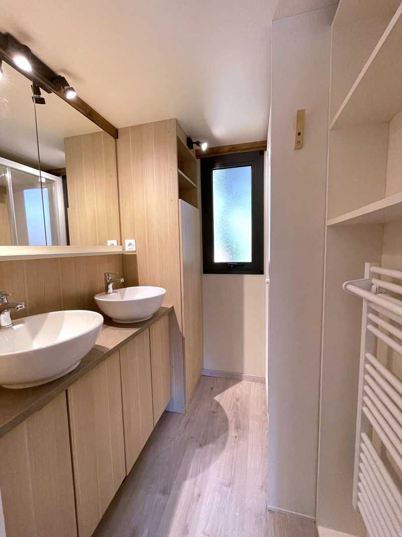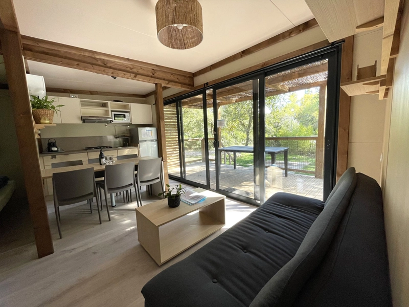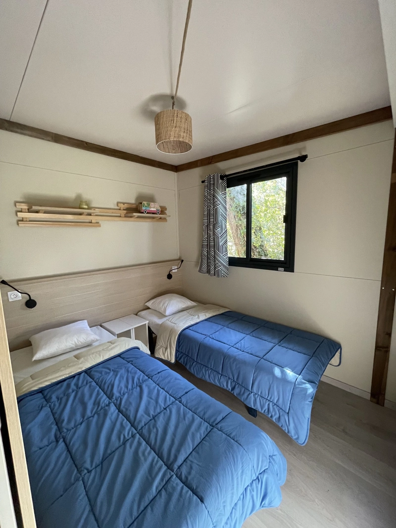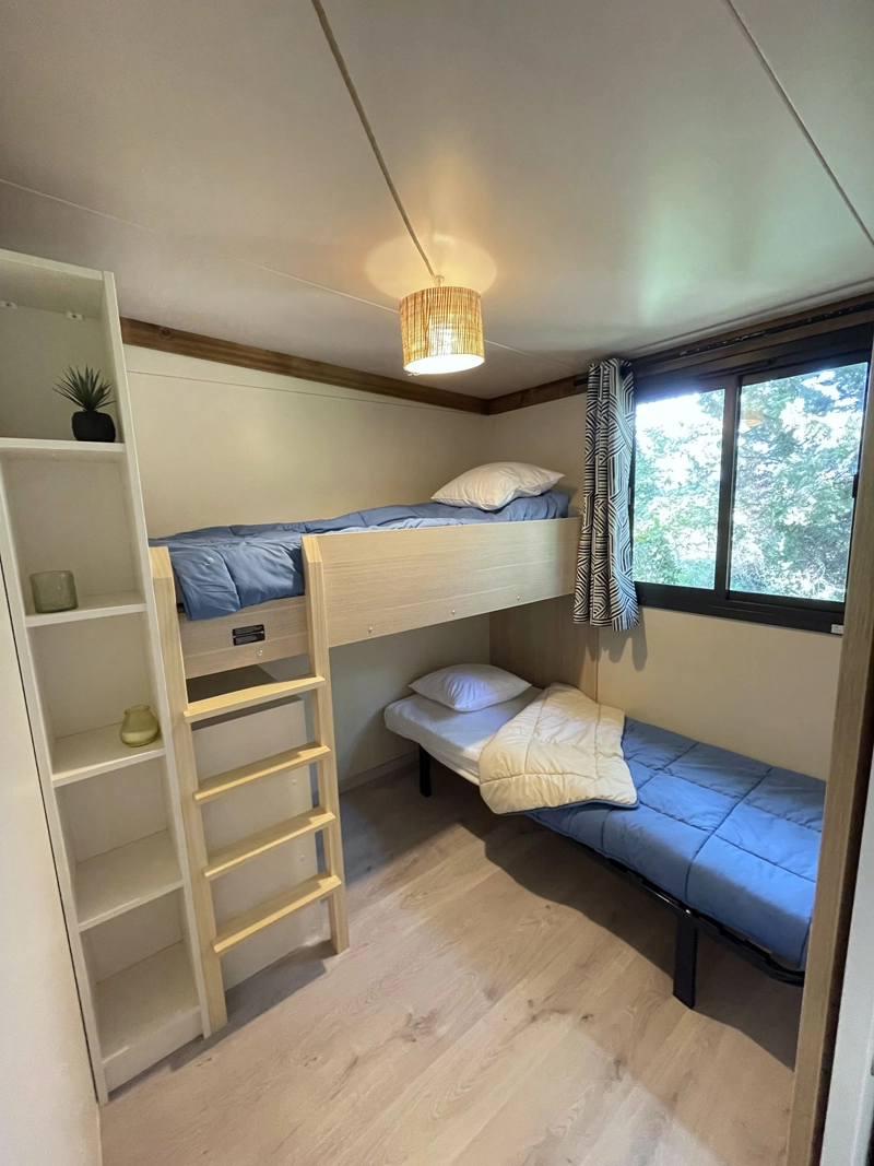 Les Rives de l'Aygues 3-star campsite in Drôme Provençale suggests this comfortable 35 m² cottage designed to accommodate 6 people. This accommodation has three separate bedrooms, one with a double bed, the other two with two single beds. This chalet has a kitchen area equipped with hotplates, fridge-freezer, microwave oven and air conditioning,. The bathroom is equipped with a shower, a double sink, the toilets are separate. To fully enjoy your peaceful campsite in Drôme Provençale, the 3-bedroom chalet has a covered outdoor terrace equipped with garden furniture. Book quickly!