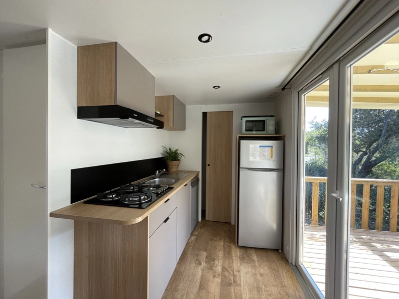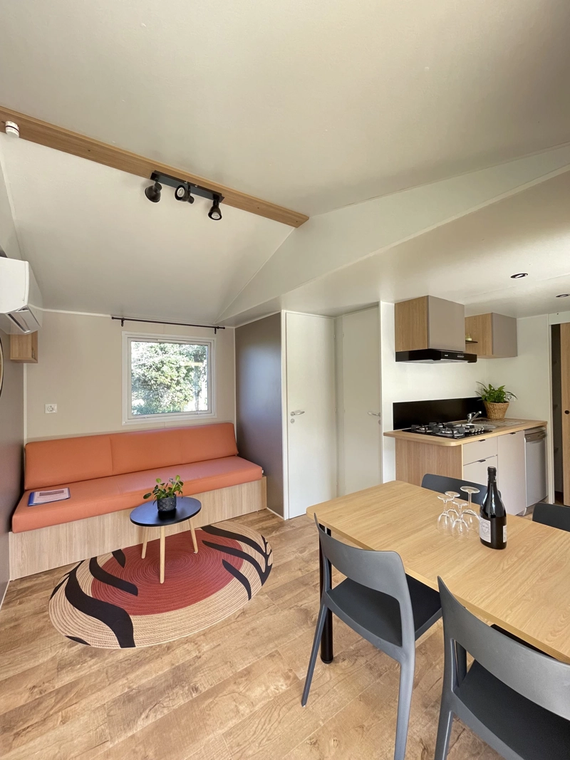Our campsite with swimming pool in Drôme Provençale offers you to stay in a comfortable mobile-home with an area of 28 m² with two separate bedrooms, which can accommodate up to 4 people. This accommodation has two bedrooms, one with a double bed, the second with two single beds, a living room with a sofa, a kitchen area with hob, fridge-freezer, microwave oven, dishwasher, air conditioning, bathroom equipped with a shower. The toilets are separate. The Rives de l'Aygues campsite accepts animals, subject to conditions. Garden furniture is at your disposal to enjoy the exteriors of your vacation rental.