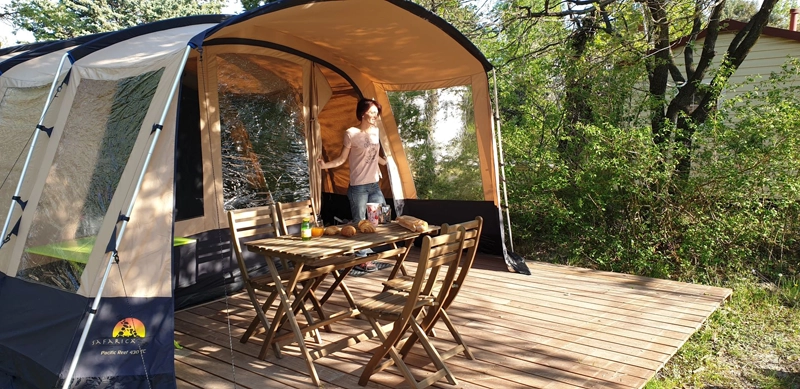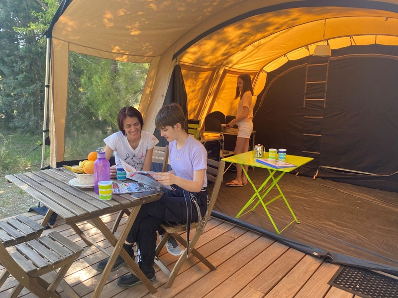 ready-to-camp» tents for all camping enthusiasts who do not want to bother with all the necessary equipment. The ready to camp will charm you.They are ideal for all hikers, cyclists and all fans of simple and hassle-free nature camping. With an area of 28 m² on a wooden floor, the tent has 3 separate bedrooms, the first with a double bed, the other 2 with a single bed. There is also a kitchen area with everything you need to cook.